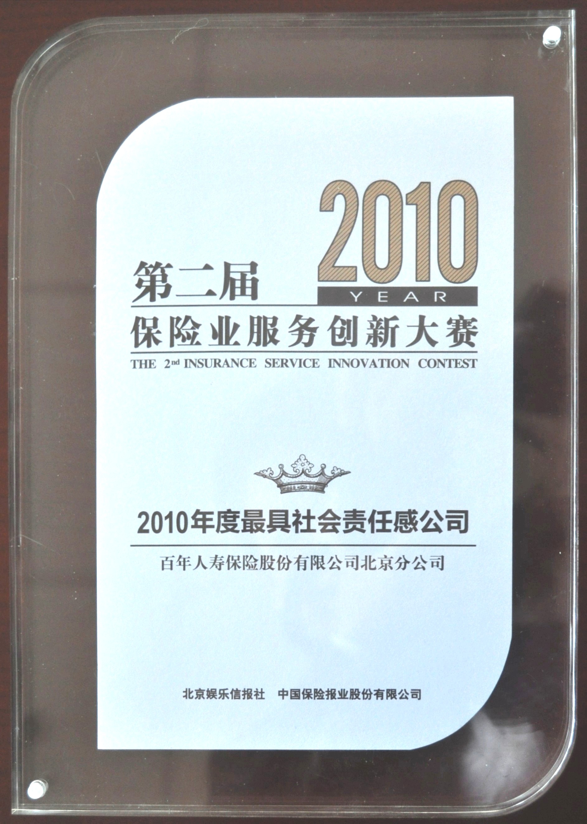 在2010年12月22日揭晓的第二届保险业服务创新大赛评选活动中,百年人寿北京分公司荣获“2010年度最具社会责任感公司”奖项。