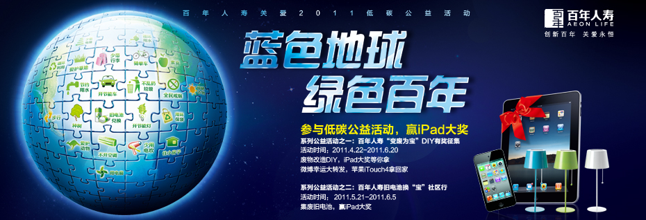 为了吸引更多公众参与活动、关注环保,百年人寿为本次“变废为宝DIY有奖征集”活动准备了非常丰厚的奖品,公众可通过上传DIY作品照片或关注活动官方微博轻松参与,赢取ipads、iTouch4大奖和太阳能台灯等众多精美环保奖品。
