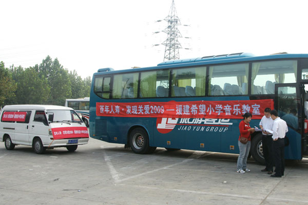 满载爱心乐器的两辆车整装待发,分赴三所小学