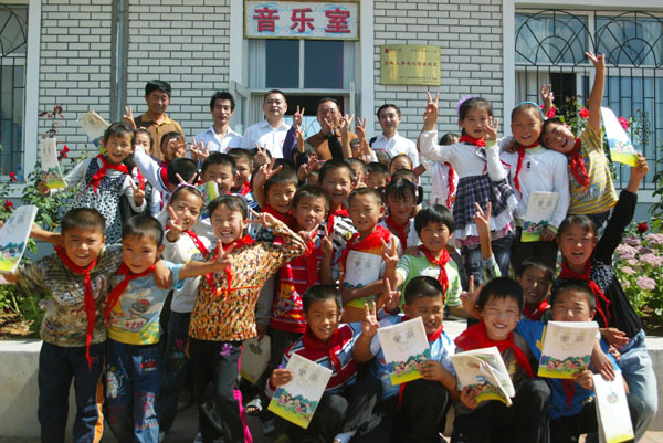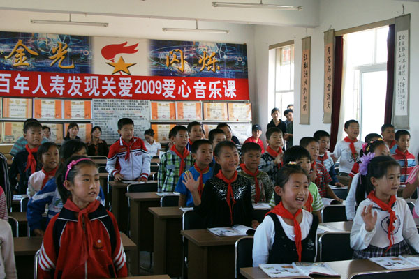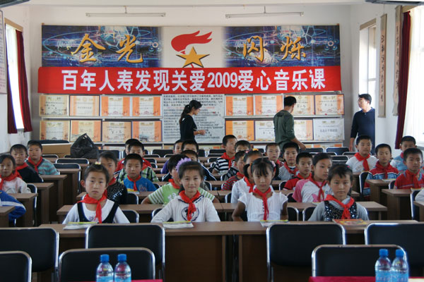 捐赠当天,当几十件爱心乐器被送到庄河市光明山镇中心小学爱心音乐教室时,正准备上音乐课的30多名学生立刻被各式各样暂新的乐器所吸引,看到这些他们期盼已久的乐器,孩子们的脸上都露出了欢快的笑容。有了这些乐器,他们就会在专业教学电子钢琴的伴奏下更好的上音乐课学习音乐知识,他们就有机会成为学校鼓乐队的一员,他们还可以拿起口琴、长笛吹奏起轻快的乐曲……在爱心志愿者大连海歌音乐学校赵广海老师的带领下,30多名学生和百年人寿的员工、爱心志愿者一起上了一堂充满快乐的音乐课。在电子钢琴的伴奏下,学生们高唱《我是小小音乐家》,优美的旋律,激情的演唱,快乐的音符在整个校园里回响。