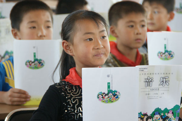 学生们跟着志愿者赵老师认真学唱《我是小小音乐家》,音乐课本后面,是一双双渴望音乐知识的眼睛