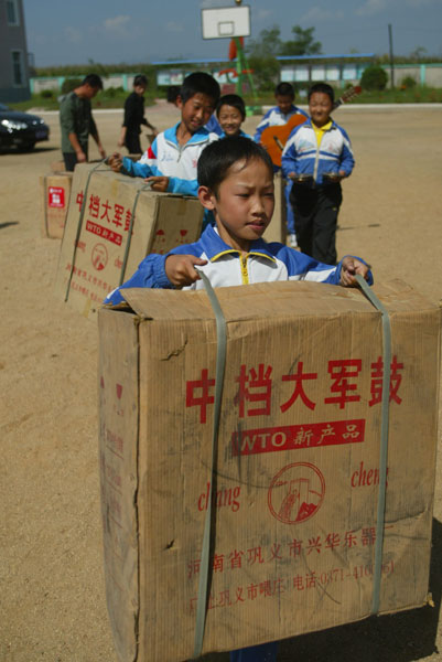 到达学校,学生们看到期盼已久的乐器,争相帮助老师运往教室