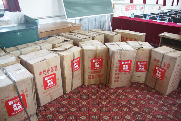 百年人寿捐赠给光明山镇中心小学的数十件鼓乐队等爱心乐器