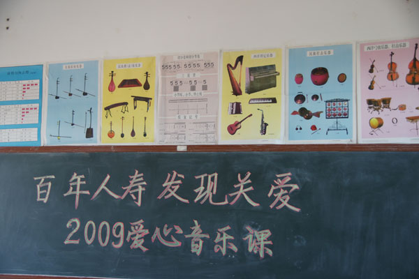 学生们以前只能靠墙上的图画来认识乐器