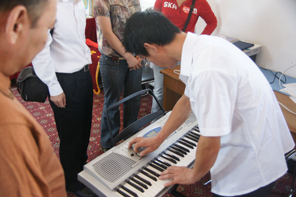 爱心志愿者赵老师在为百年人寿捐赠的教学用电子钢琴认真调音